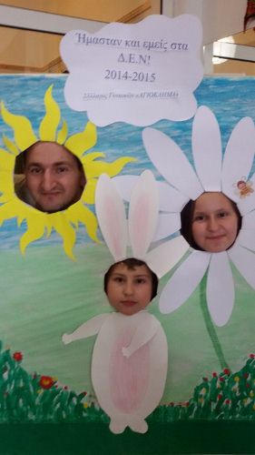 Στη γωνιά αναμνηστικής φωτογραφίας στεκόταν ένα χειροποίητο σταντ όπου χωρούσαν όλα τα πρόσωπα. Καλούσε μικρούς και μεγάλους σε μια παιχνιδιάρικη φωτογραφία για ενθύμιο, με τίτλο Ήμασταν και εμείς στα Δ.Ε.Ν 2014-2015! Σύλλογος Γυναικών “Αγιόκλημα”. Ο καθένας διάλεγε να βγει φωτογραφία σε όποια εικόνα ήθελε και όσες φορές ήθελε. Τα παιδιά χαρήκαν πάρα πολύ αλλά ήταν και ευκαιρία και για οικογενειακές φωτογραφίες. Σε εμάς πρόσφερε μεγάλο ενθουσιασμό από την δημιουργία έως το την τελική του χρήση.